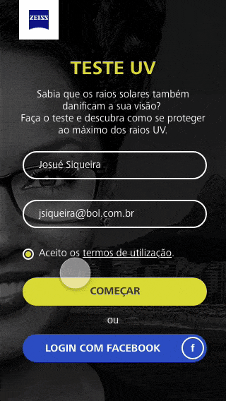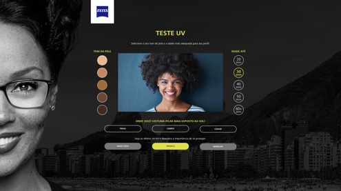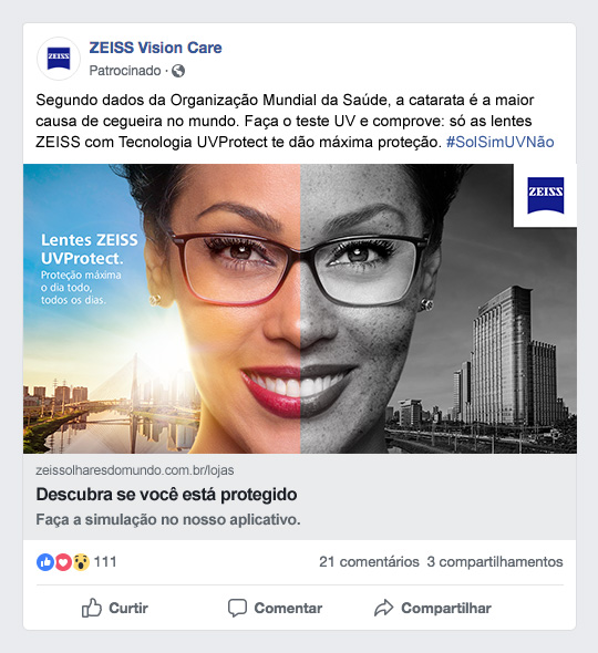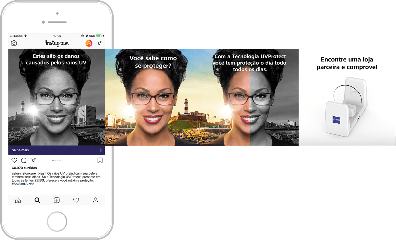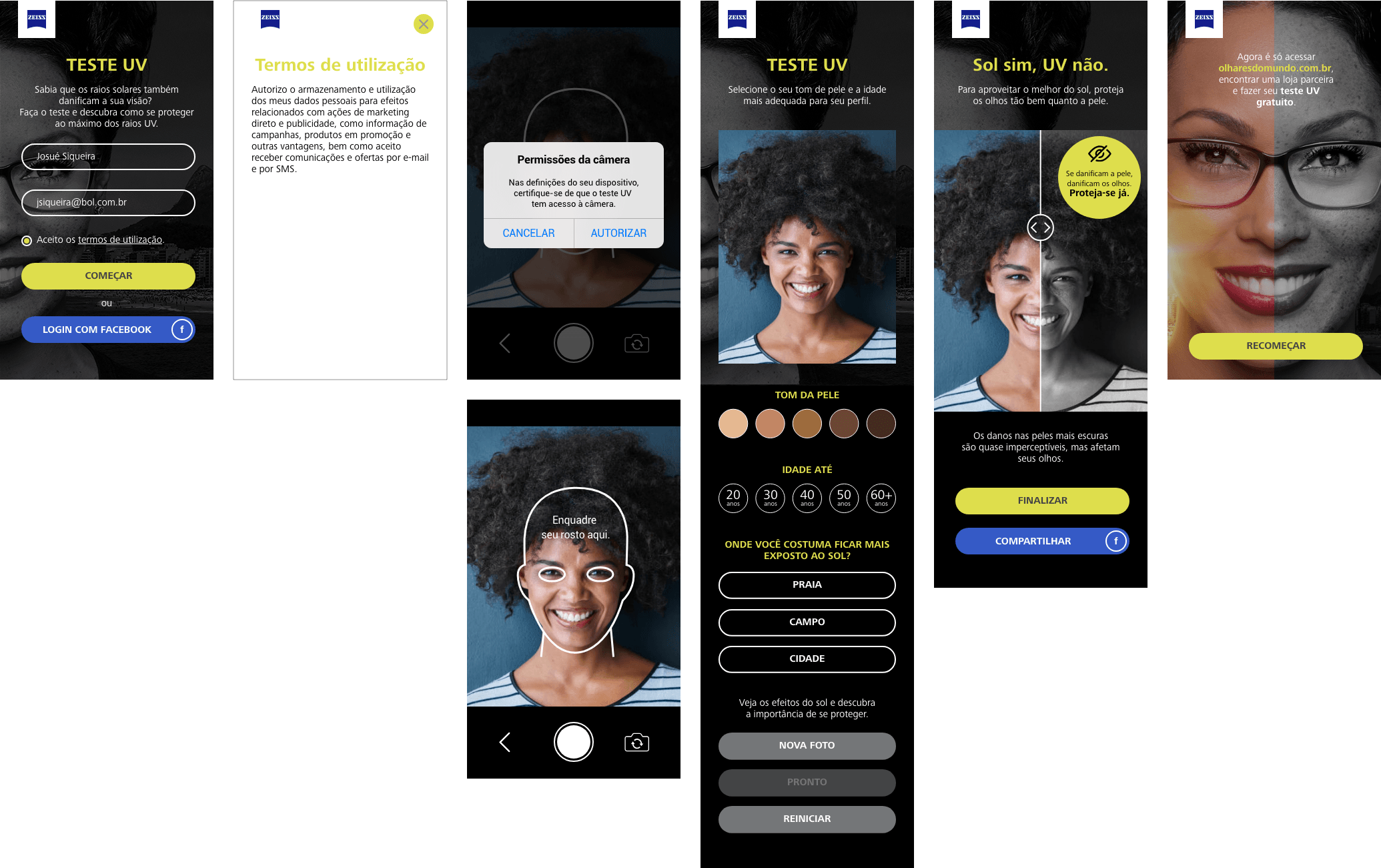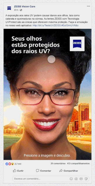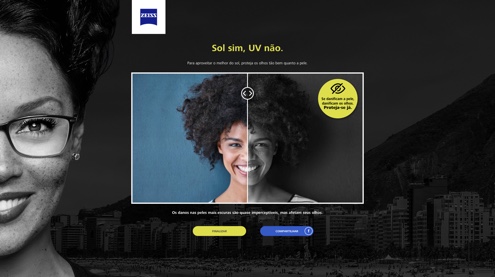 Nessa campanha, o foco era mostrar como os raios UV prejudicam também os olhos e não só a pele. Foi feito um site/app responsivo para mostrar as pessoas o que os raios UV fazem com a pele delas e com o resultado final levam ela para fazer o teste UV (físico) numa ótica parceira. E também peças para mídia online, para facebook e instagram.